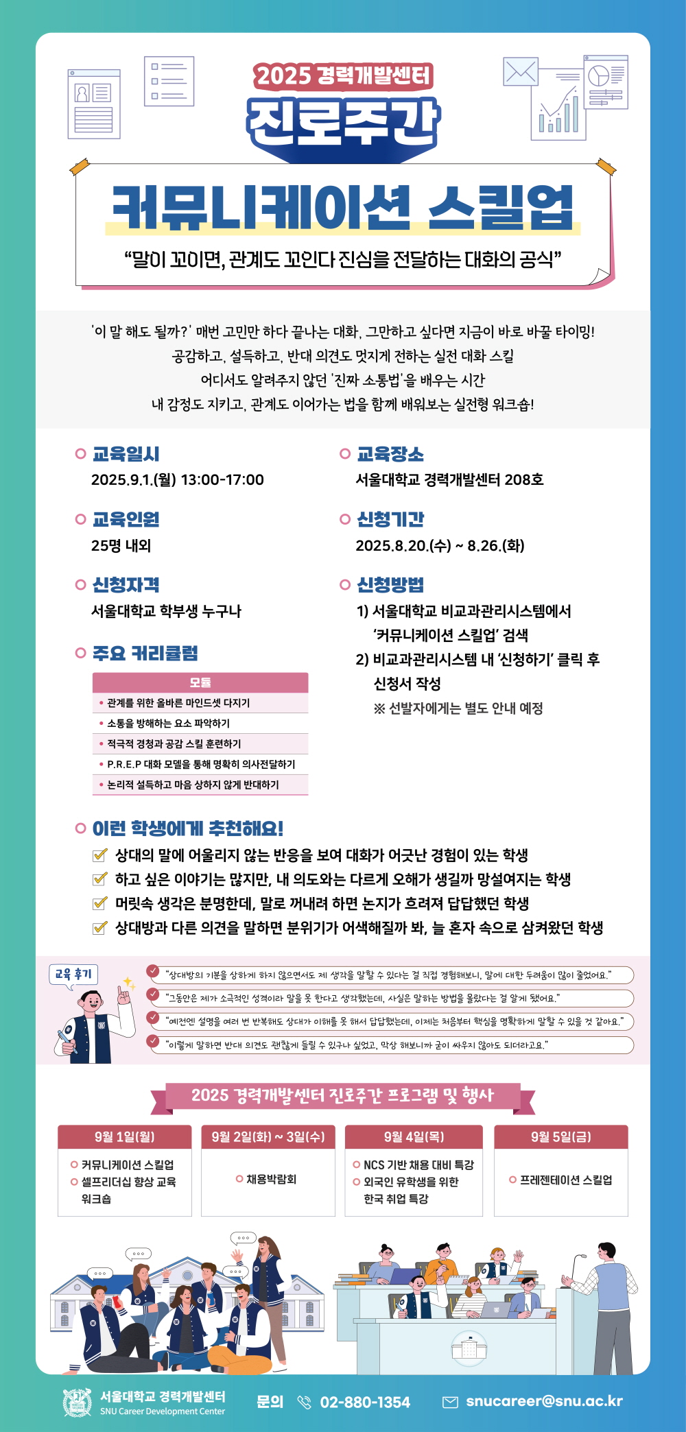 경력개발센터에서 [2025 경력개발센터 진로주간]을 맞이하여 "커뮤니케이션 스킬업" 프로그램을 실시할 예정입니다.