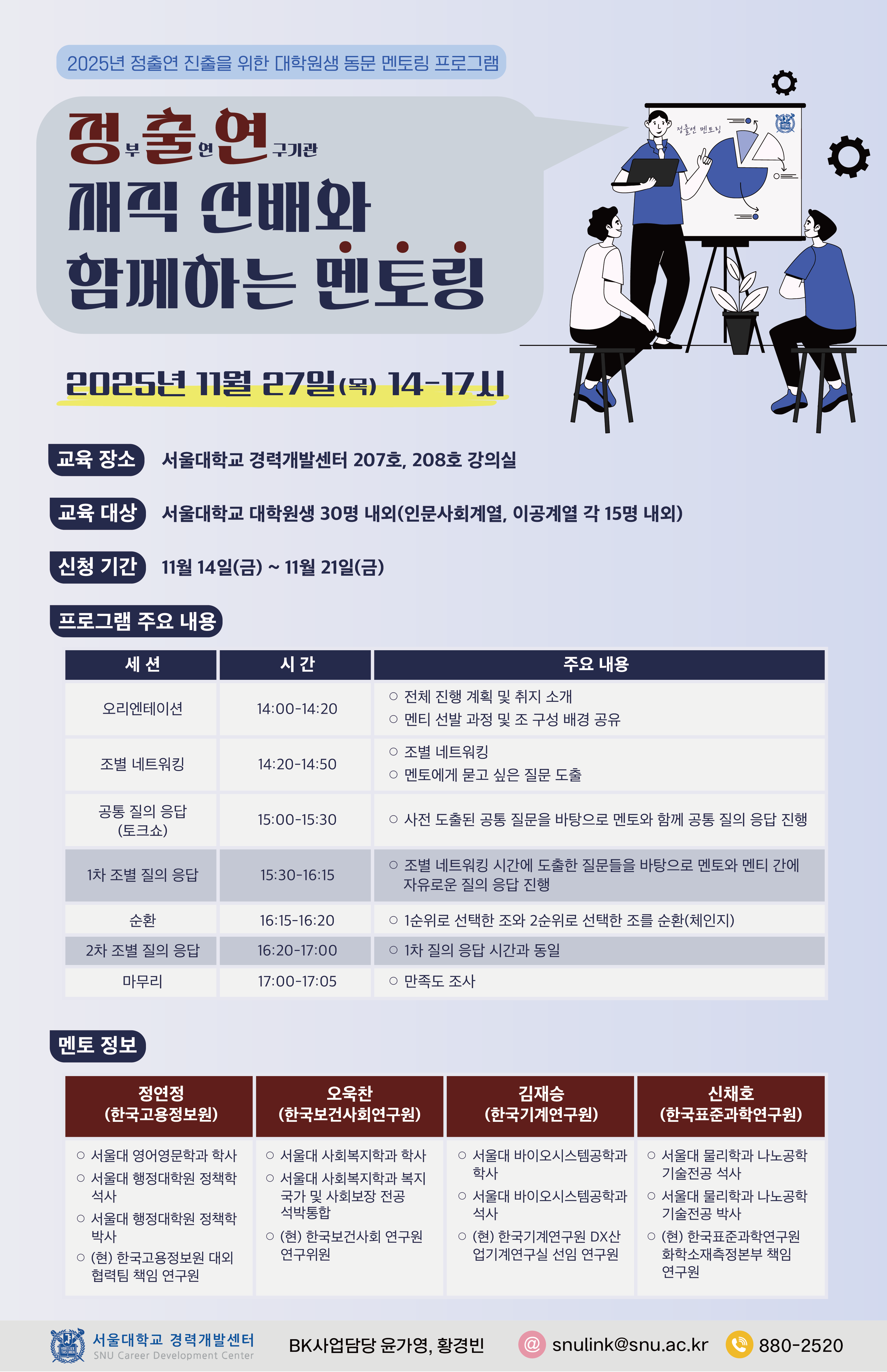 로그인KREN비교과관리시스템 비교과 프로그램전체보기교육 (특강/세미나)공모전/경진대회현장학습/인턴사회공헌 (봉사)학습/진로상담레크리에이션기타상담신청취업컨설팅학습상담글쓰기상담나의 활동비교과이력환경설정안내공지사항Q&A자료실모집상태전체모집중마감임박모집마감모집대기프로그램 유형전체교육(특강/세미나)공모전/경진대회현장학습/인턴사회공헌(봉사)학습/진로상담레크리에이션기타핵심역량전체공동체역량도전역량학문탐구역량리더십역량문제해결역량협업역량자기관리역량조회기간당일1주일1개월3개월6개월1년직접 입력 ~조회기준등록일신청시작일신청마감일운영시작일운영마감일캠퍼스구분전체관악캠퍼스연건캠퍼스수원캠퍼스평창캠퍼스시흥캠퍼스운영부서인기검색어#부하테스트#openlnl#튜터링#피어튜터링#비교과#snuti#등산#전공탐구#미산#OpenLnL초기화검색