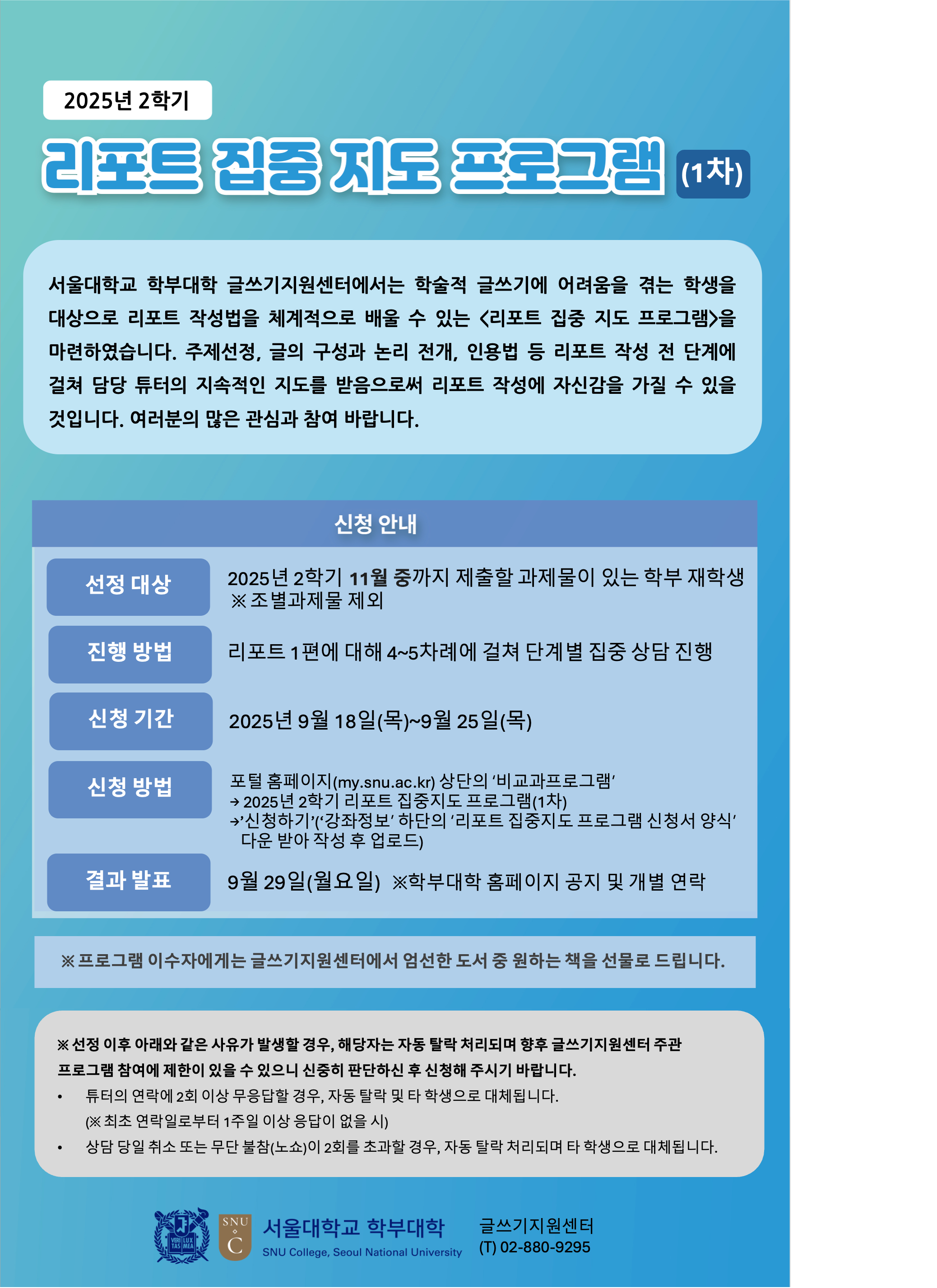 서울대학교 학부대학 글쓰기지원센터에서는 학술적 글쓰기에 어려움을 겪는 학생을 대상으로 리포트 작성법을 체계적으로 배울 수 있는 <리포트 집중지도 프로그램>을 마련하였습니다. 주제 선정, 글의 구성과 논리 전개, 인용법 등 리포트 작성 전 단계에 걸쳐 담당 튜터의 지속적인 지도를 받음으로써 리포트 작성에 자신감을 가질 수 있을 것입니다. 여러분의 많은 관심과 참여 바랍니다.